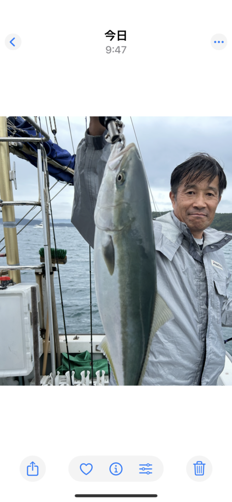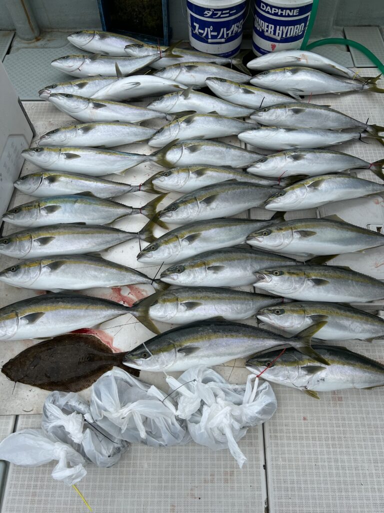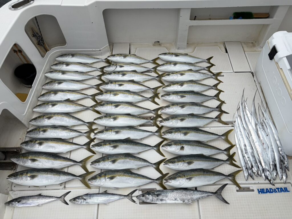 開始早々から毎流しヒット有りで 5人ヒットもありクーラー満タン👍 最後に少しだけ太刀魚を釣って頂き早上がり‼️ 青物は飲ませの釣果です。