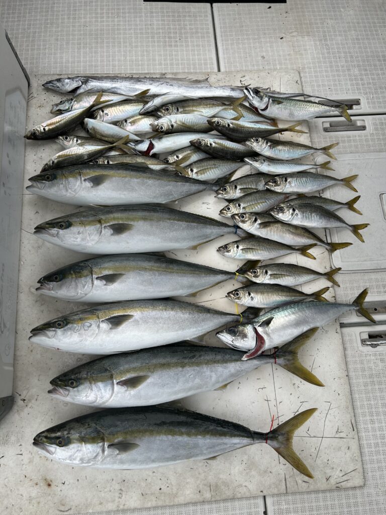 青物は期待していた時合無く撃沈モードでしたが、 良い群れにアタリひと流しで全員安打👍👍👍 太刀魚は少しだけ狙いましたが、アタリ少なく早々に諦めました。 アジはバタバタヒット有りで良く釣れました👍