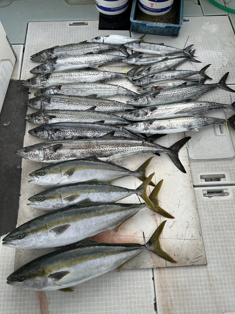 潮の緩い時はサワラ‼️ 動き出せば青物‼️ ブリのバラシやラインブレイクもありましたが 皆さんバグースに楽しんで頂けました👍👍👍